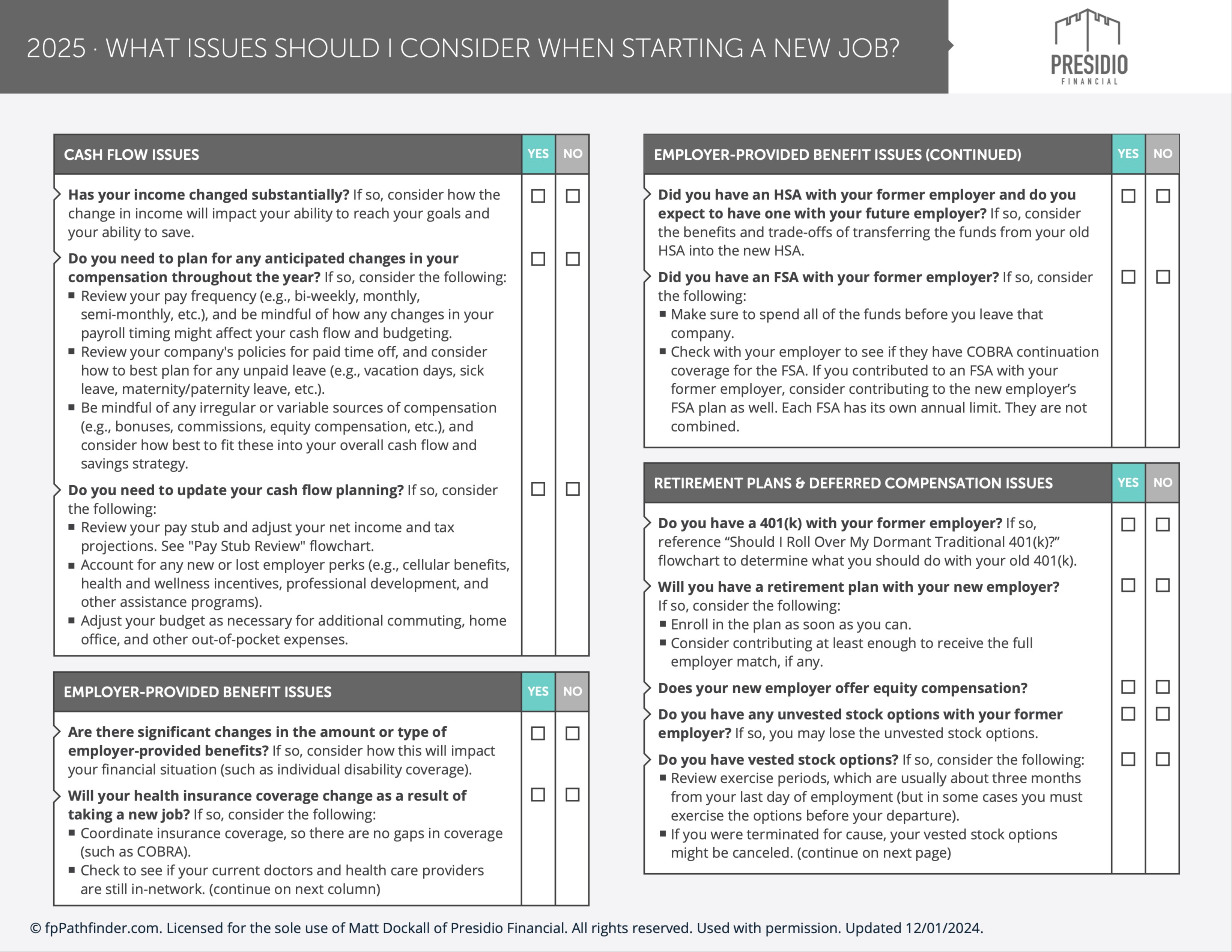 A career transition is more than a professional move—it’s also a financial one. By proactively addressing cash flow, benefits, retirement planning, and tax considerations, you can position yourself for a smooth transition and long-term success. You can review the entire checklist below. If you’d like guidance on navigating these decisions, our team is here to help.