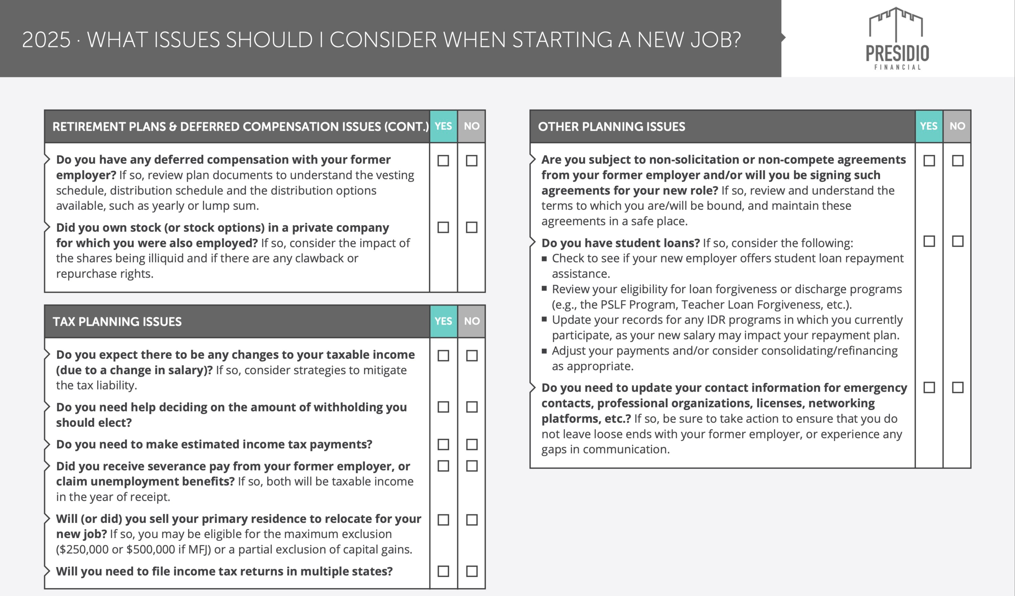 A new job often marks an exciting chapter—fresh opportunities, new colleagues, and the potential for career growth. But with that transition comes an important financial checklist that can help you avoid missteps and make the most of your new role. At Presidio Financial, we believe that taking time to review your financial picture during this transition can pay dividends for years to come.