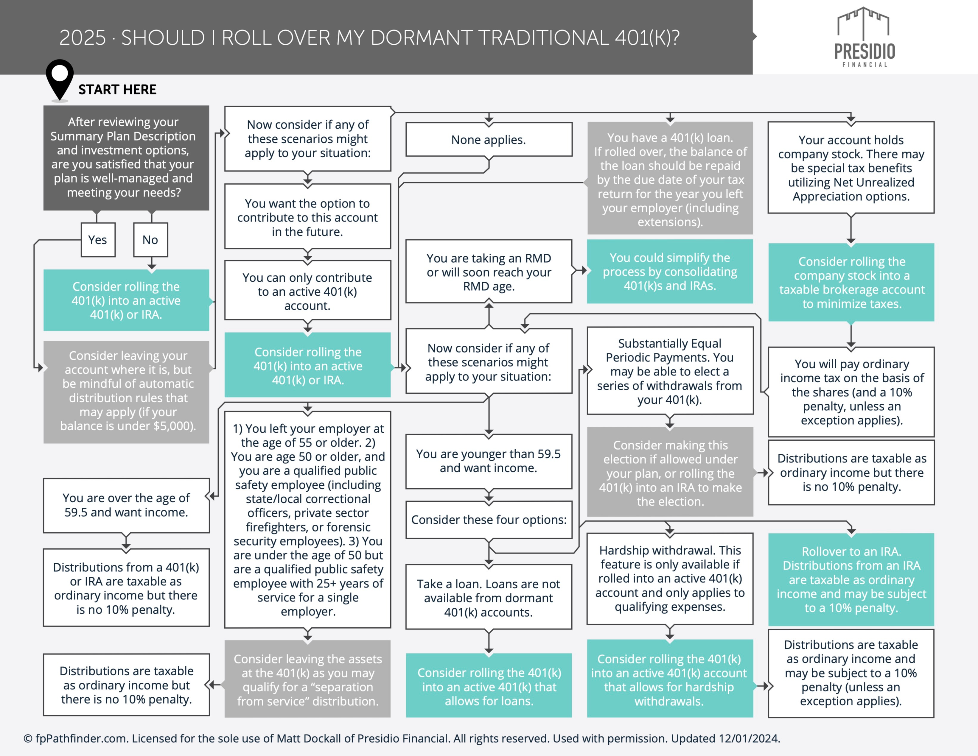 At Presidio Financial, we regularly help clients evaluate what to do with an old employer 401(k). We walk through each option to help you make the best decision for your goals, taxes, and peace of mind.